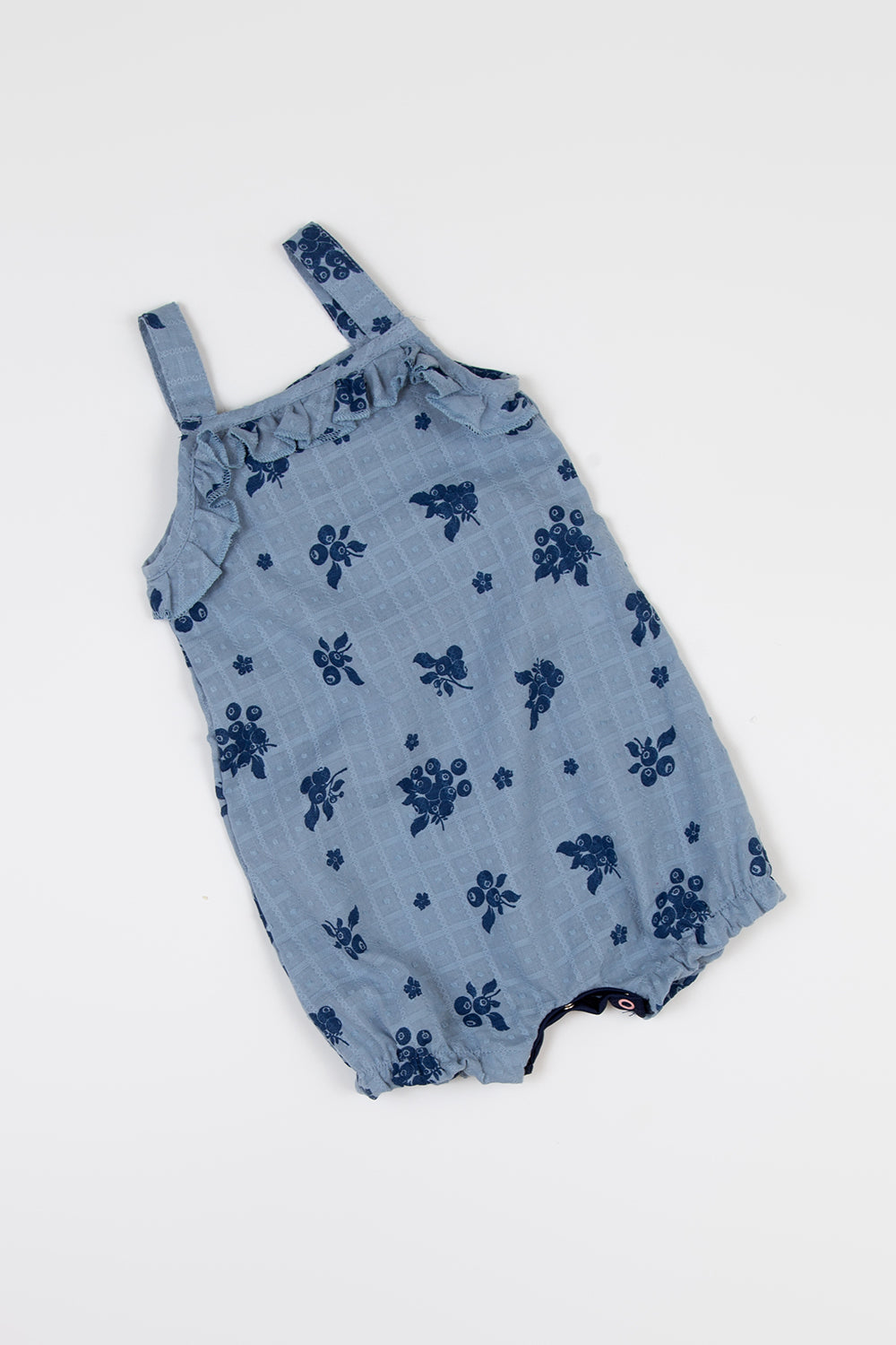 Em um delicado tom azul bebê, com estampa de inspiração retrô, o modelo ganha ainda mais charme com as alcinhas e os babadinhos sutis. Para facilitar o dia a dia, conta com abertura de botões no entrepernas, tornando a troca rápida e prática.