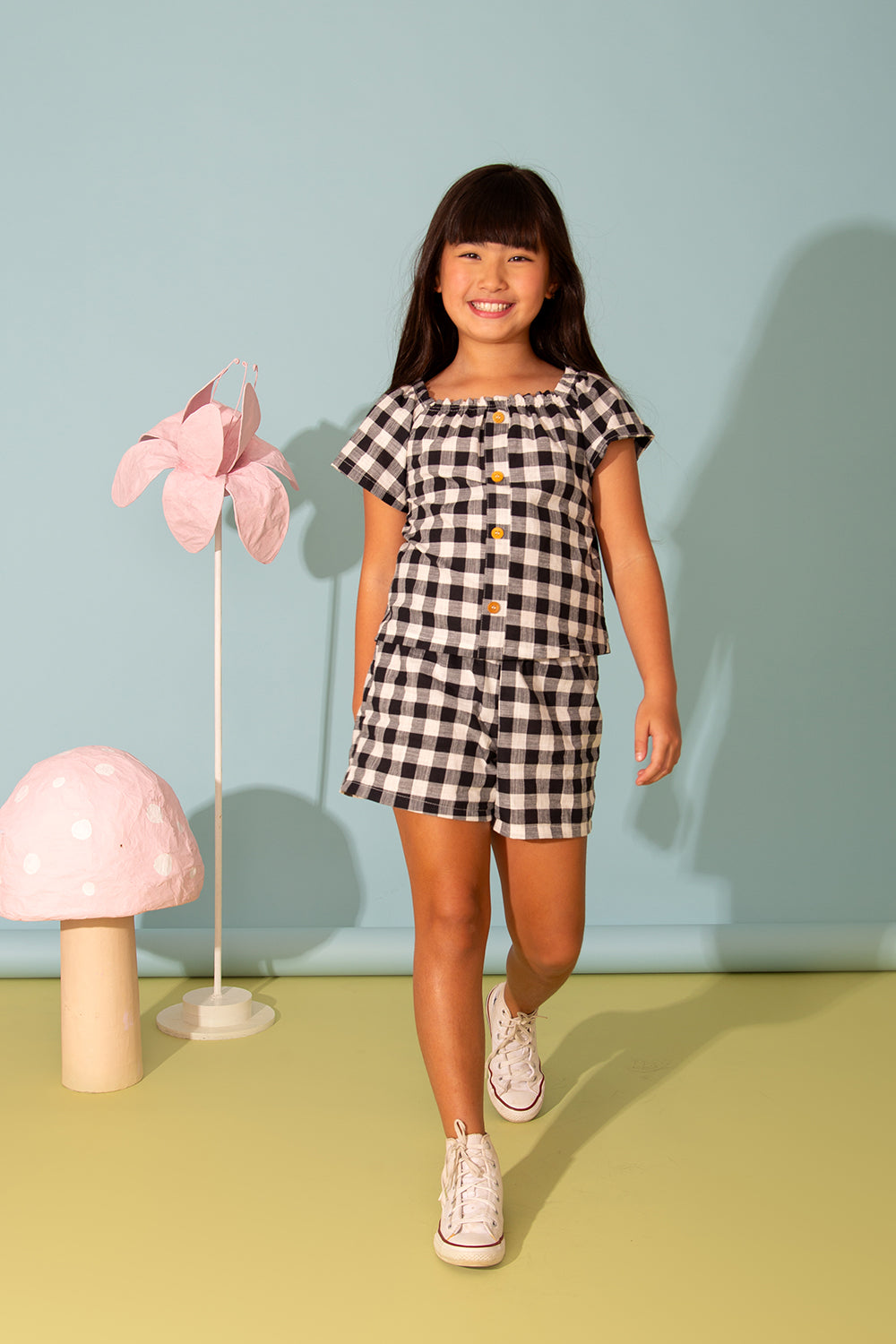 Composto por batinha em xadrez preto e branco e shorts na mesma estampa, o conjunto é delicado e moderno ao mesmo tempo. A batinha conta com elástico no decote e botõezinhos decorativos de madeira, que adicionam um charme rústico e encantador.